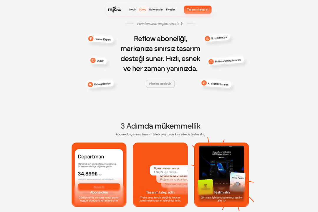 reflow, e-ticaret markaları ve startuplar için tasarım aboneliği sunan bir platform. The BoldMark olarak reflow'un Framer üzerindeki web sitesini tasarladık ve geliştirdik.Abonelik akışı, CMS yapısı ve ödeme entegrasyonu dahil tüm teknik altyapıyı kurarak markayı dijitalde hayata geçirdik.